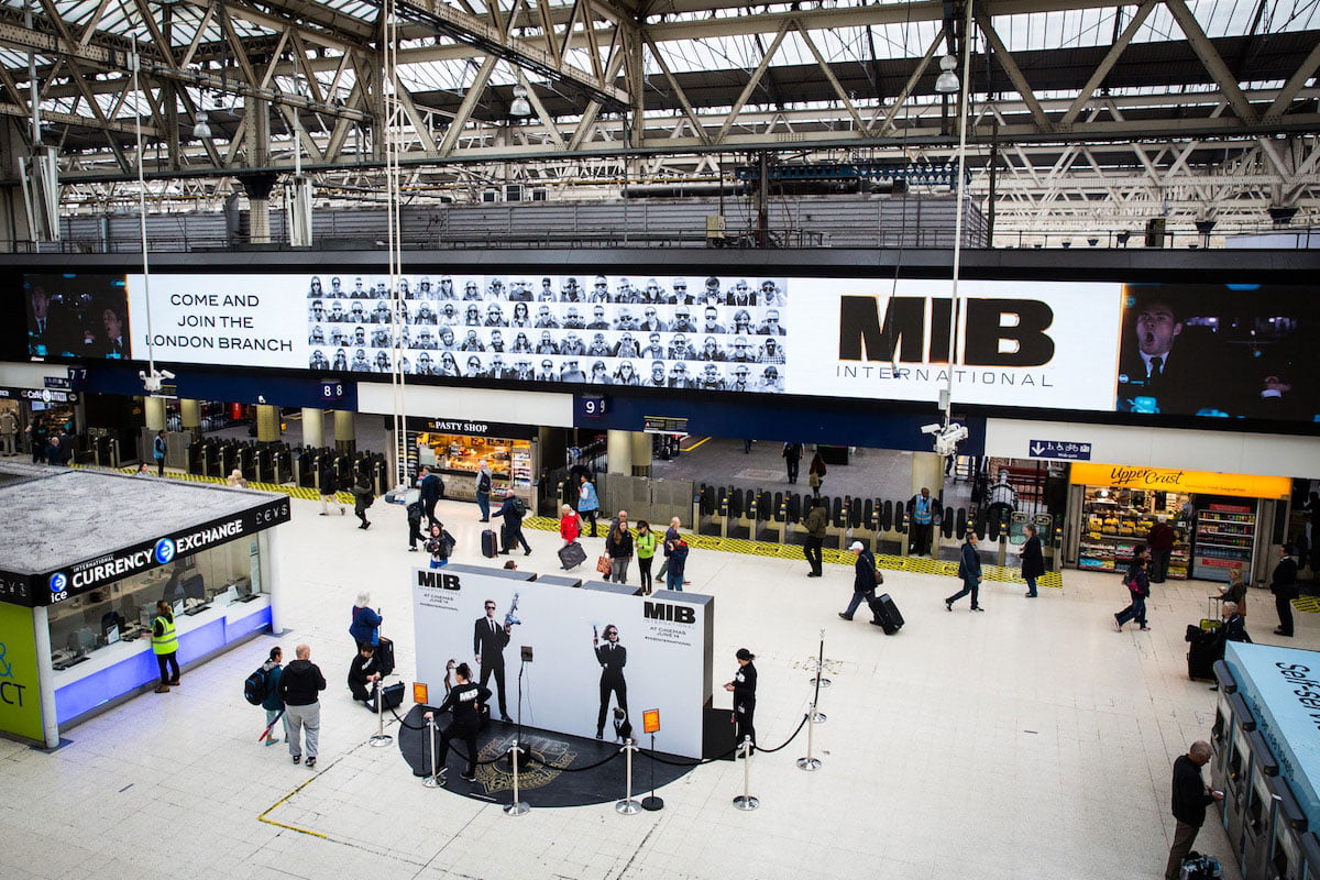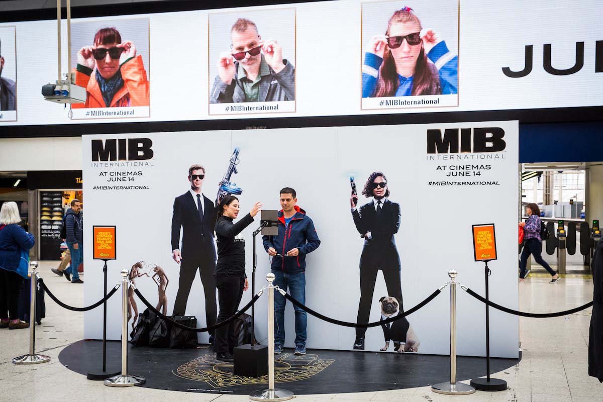 Men In Black: International created a memorable experience in the heart of Waterloo Station. Ahead of the MIB activation at Waterloo, the immersive stand invited commuters to join the Men In Black London Branch. One of the features from the stand included the opportunity to create your ‘Branch ID’ video. Our custom made app creates a looped video of visitors reminiscent of the classic Men In Black sunglasses scene. For each video, you can wear and take home the iconic MIB black sunglasses. The visitors could send their videos instantly via social media and e-mail. After this, the video appeared live on the big motion screen at Waterloo.